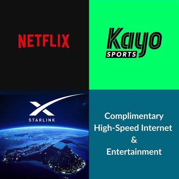 · Internet & Entertainment: Experience high-speed, low-latency internet powered by Starlink, and stay connected like never before. Plus, get access to a world of entertainment with complimentary access to Netflix and Kayo Sports. Kayo Sports offers live streaming of popular sports like AFL, NRL, Cricket, F1, Golf, and more. Meanwhile, Netflix brings you a vast library of movies, TV shows, documentaries, and award-winning Netflix Originals. Get ready for endless hours of entertainment, all in one place.